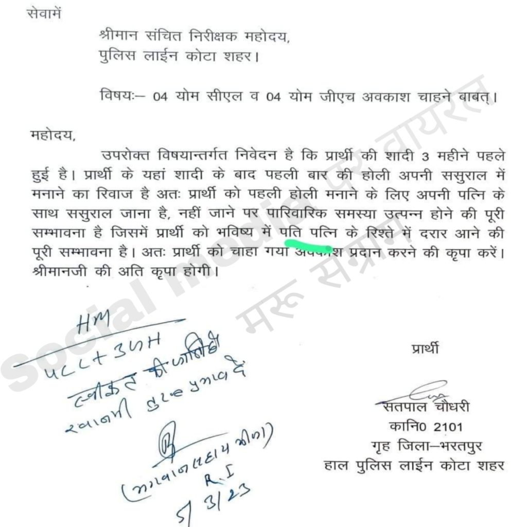 भरतपुर से कॉन्स्टेबल सतपाल चौधरी ने अधिकारियों को लिखा पत्र। मेरी हुई है नई नई शादी, रिवाज के अनुसार होली पर ससुराल में जाना पड़ेगा। नहीं जाने पर पति-पत्नी के रिश्ते में भविष्य में दरार आने की पूरी संभावना है। कृपया अवकाश स्वीकृत करें।