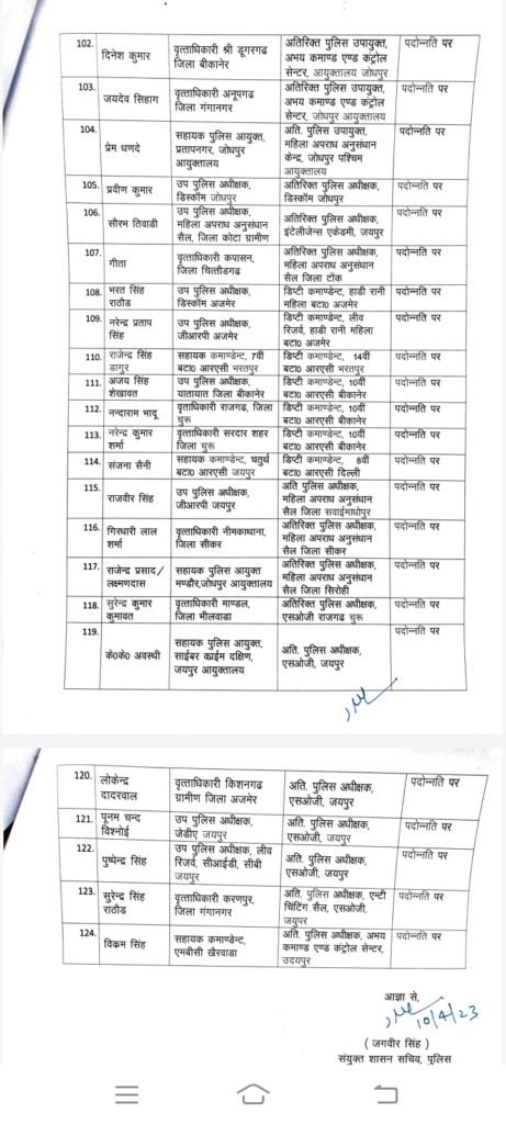बीकानेर, @Marusangram। 124 आरपीएस अफसरों के हुए तबादले