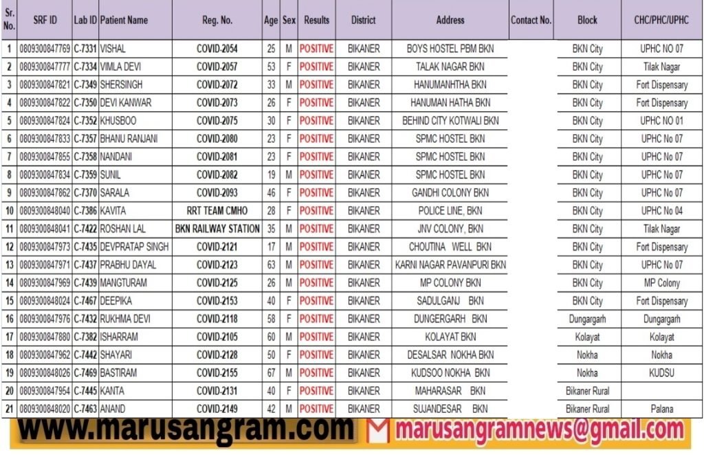बीकानेर: कोरोना के 21 नए पॉजिटिव के साथ कुल एक्टिव केस हुए 82, इन‌ क्षेत्रों में मिलें पाॅजिटिव…..