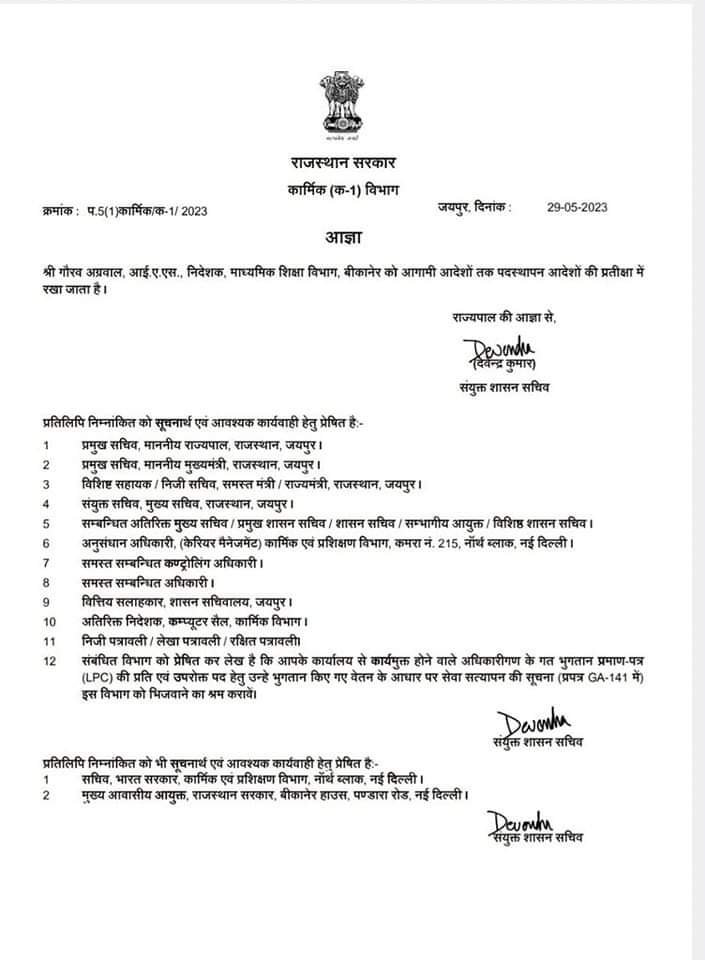 Bikaner, @Marusangram. In connection with the promotion of Anil alias Sher Singh Meena, the mastermind of senior teacher recruitment paper leak, the state government has removed Director of Secondary Education Gaurav Agarwal from his post. Gaurav has been placed on waiting for posting (APO). Presently attendance will have to be given in Jaipur only.