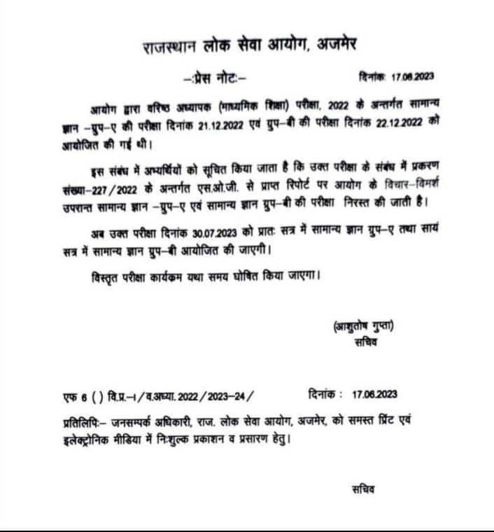 इस संबंध में अभ्यर्थियों को सूचित किया जाता है कि उक्त परीक्षा के संबंध में प्रकरण संख्या-227 / 2022 के अन्तर्गत एस.ओ.जी. से प्राप्त रिपोर्ट पर आयोग के विचार-विमर्श उपरान्त सामान्य ज्ञान – ग्रुप-ए एवं सामान्य ज्ञान ग्रुप-बी की परीक्षा निरस्त की जाती है। अब उक्त परीक्षा दिनांक 30.07.2023 को प्रातः सत्र में सामान्य ज्ञान ग्रुप-ए तथा सायं सत्र में सामान्य ज्ञान ग्रुप-बी आयोजित की जाएगी। विस्तृत परीक्षा कार्यक्रम यथा समय घोषित किया जाएगा।