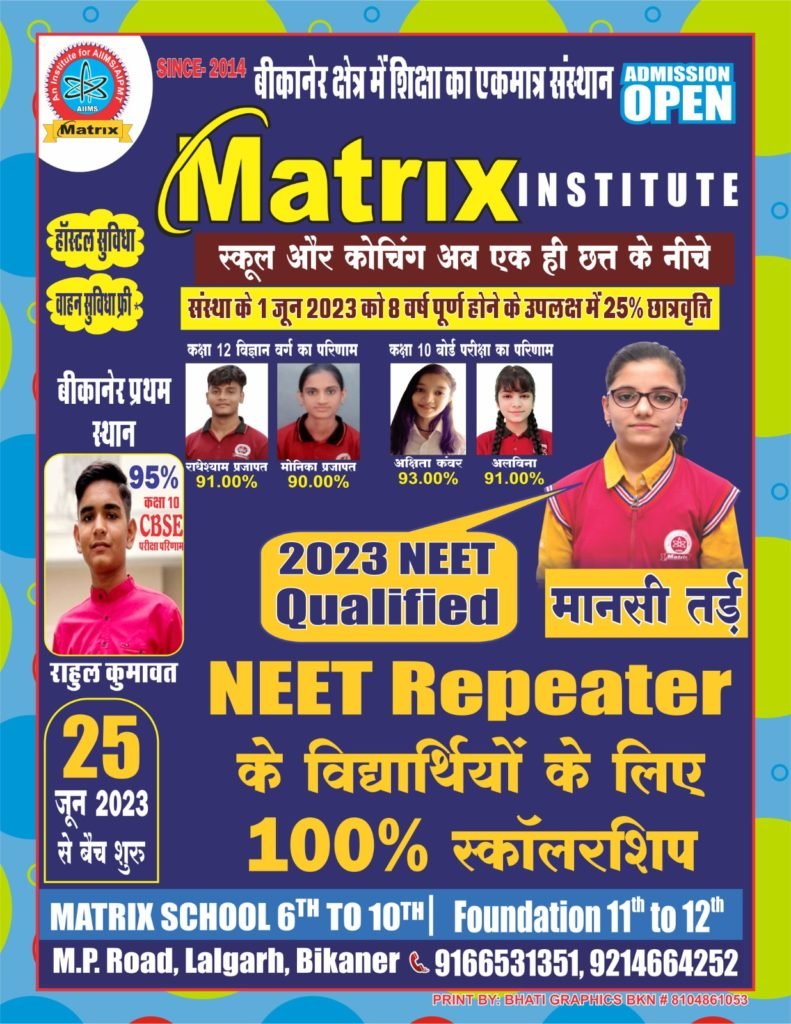 Due to the full seats of the batch running in the morning shift at the Matrix Institute located on Rampura Basti Mukta Prasad Road, Bikaner, the new batch in the evening shift is starting from Monday, July 3, 2023.