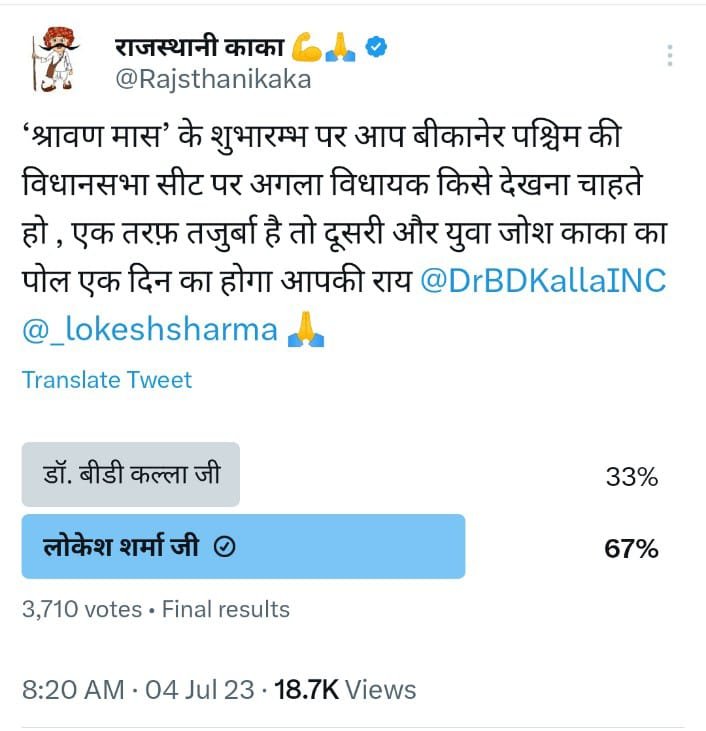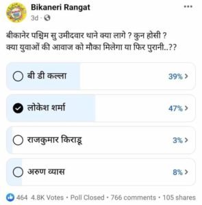 In fact, two surveys conducted these days on two different platforms of Bikaner’s social media are in discussion. First, the Facebook page of Bikaneri Rangat. In this, the operator of the page conducted a survey among four potential candidates. Lokesh Sharma was ahead in this. On the other hand, a Twitter handle named Rajasthani Kaka put a big question mark on the universality of Dr. Kalla. It also seems that Dr. Kalla has also become aware of this somewhere or the other. That’s why they are proving themselves young in front of the media. By the way, the controversy arising out of the eviction of Dr. Kalla’s bungalow had not subsided so far that even advising Lokesh Sharma to leave the government job seems ridiculous in political circles.