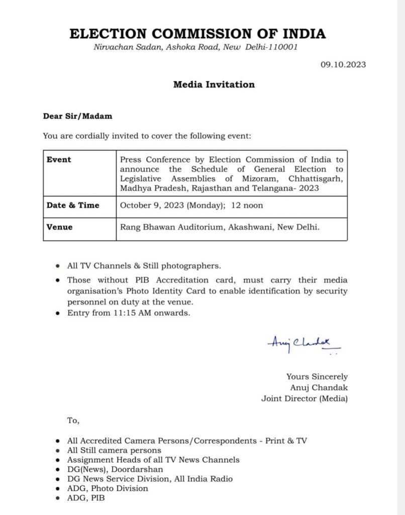 मध्य प्रदेश, राजस्थान, छत्तीसगढ़, तेलंगाना व मिजोरम में चुनाव होंगे।