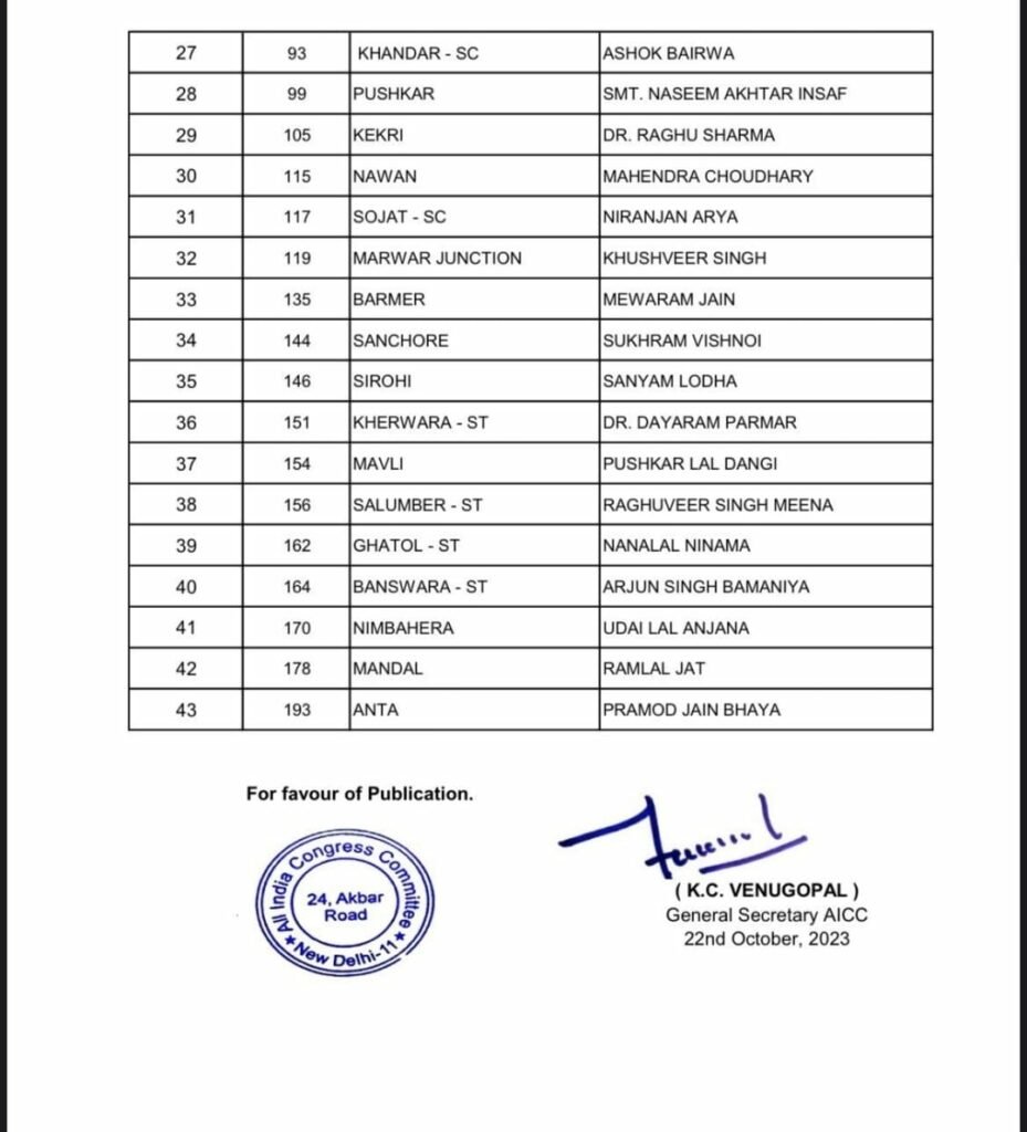 राजस्थान में कांग्रेस प्रत्याशियों की दूसरी लिस्ट जारी
