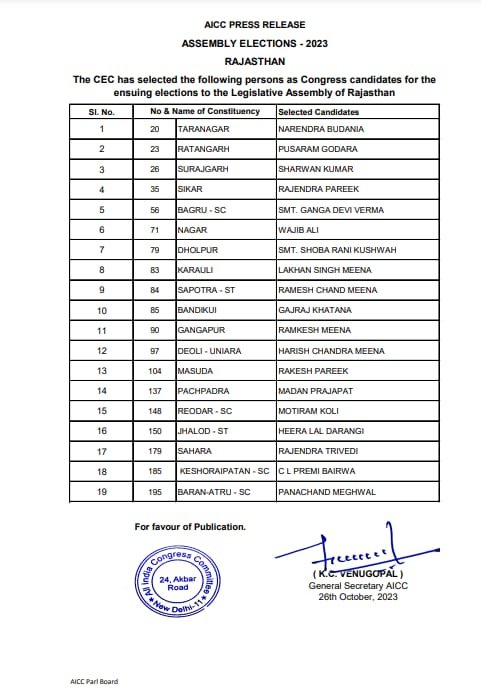 Rajasthan Congress names 1 minister and 11 MLAs in the third list of 19 candidates.