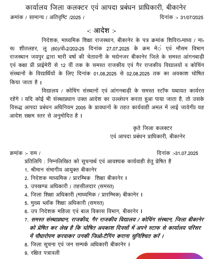बीकानेर, @MaruSangram। राजस्थान में संभावित भारी बारिश को लेकर मौसम विभाग की चेतावनी के मद्देनज़र बीकानेर जिला प्रशासन ने बड़ा फैसला लिया है।