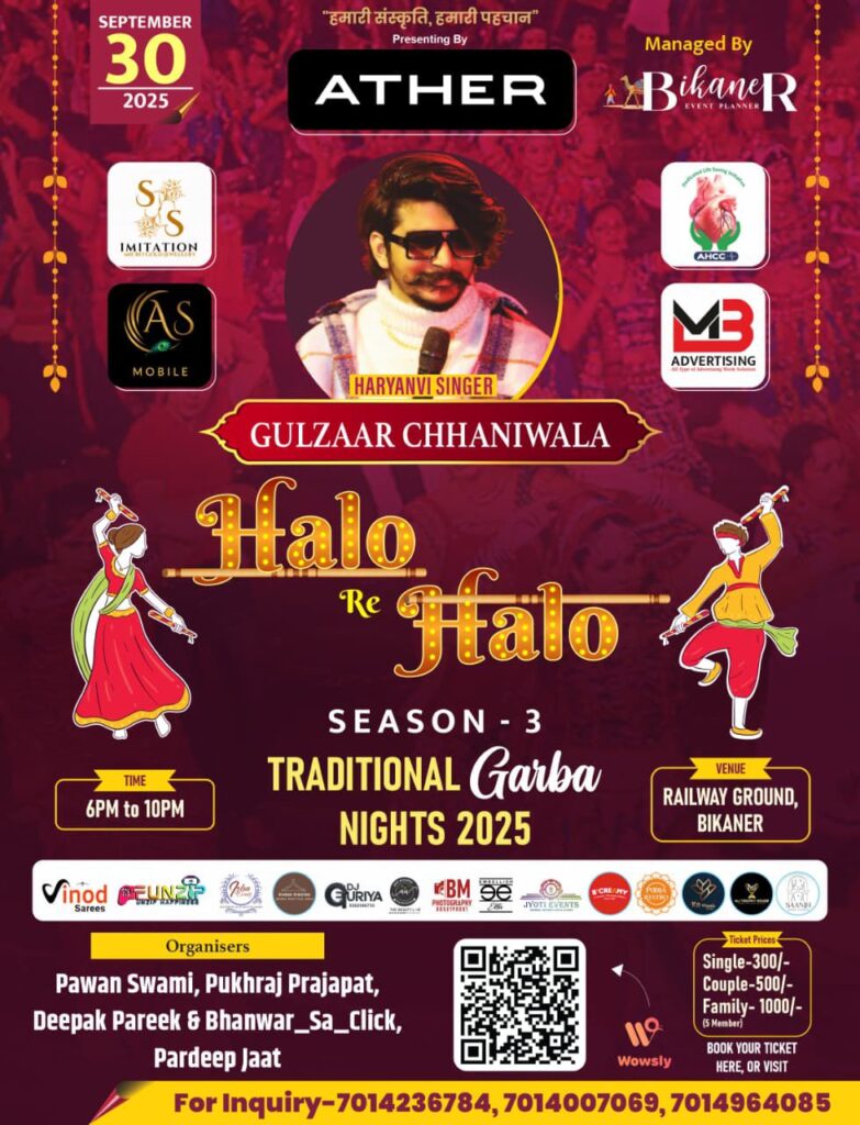 बीकानेर, @MaruSangram। नवरात्रा में गरबा की धूम के बीच शहर के रेलवे स्टेडियम में 30 सितम्बर को “हालो रे हालो सीजन-3” का आयोजन होगा।