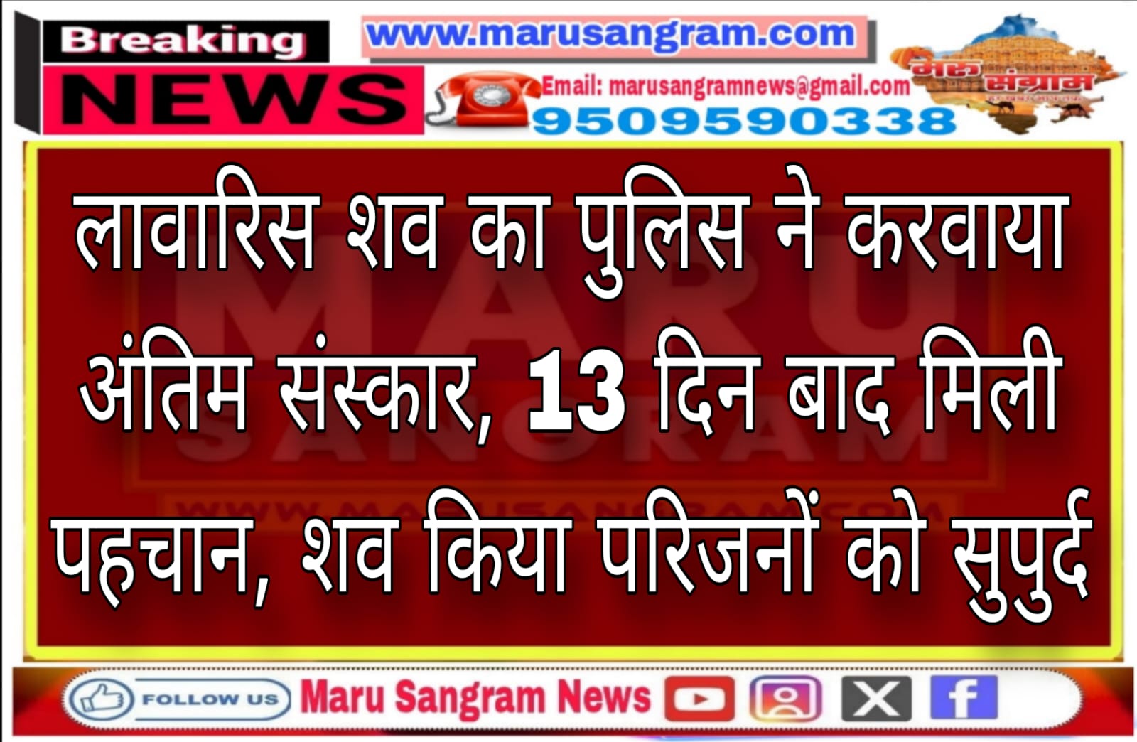 लावारिस शव का पुलिस ने करवाया अंतिम संस्कार, 13 दिन बाद मिली पहचान, शव किया परिजनों को सुपुर्द…..