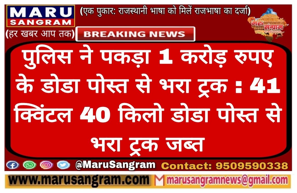पुलिस ने पकड़ा 1 करोड रुपए के डोडा पोस्त से भरा ट्रक : 41 क्विंटल 40 किलो डोडा पोस्त से भरा ट्रक जब्त…..