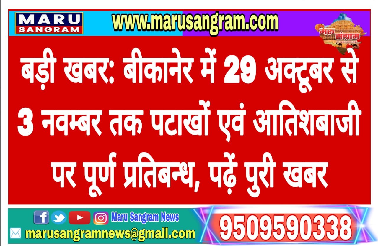 बड़ी खबर: बीकानेर में 29 अक्टूबर से 3 नवम्बर तक पटाखों एवं आतिशबाजी पर पूर्ण प्रतिबन्ध, पढ़ें पुरी खबर……
