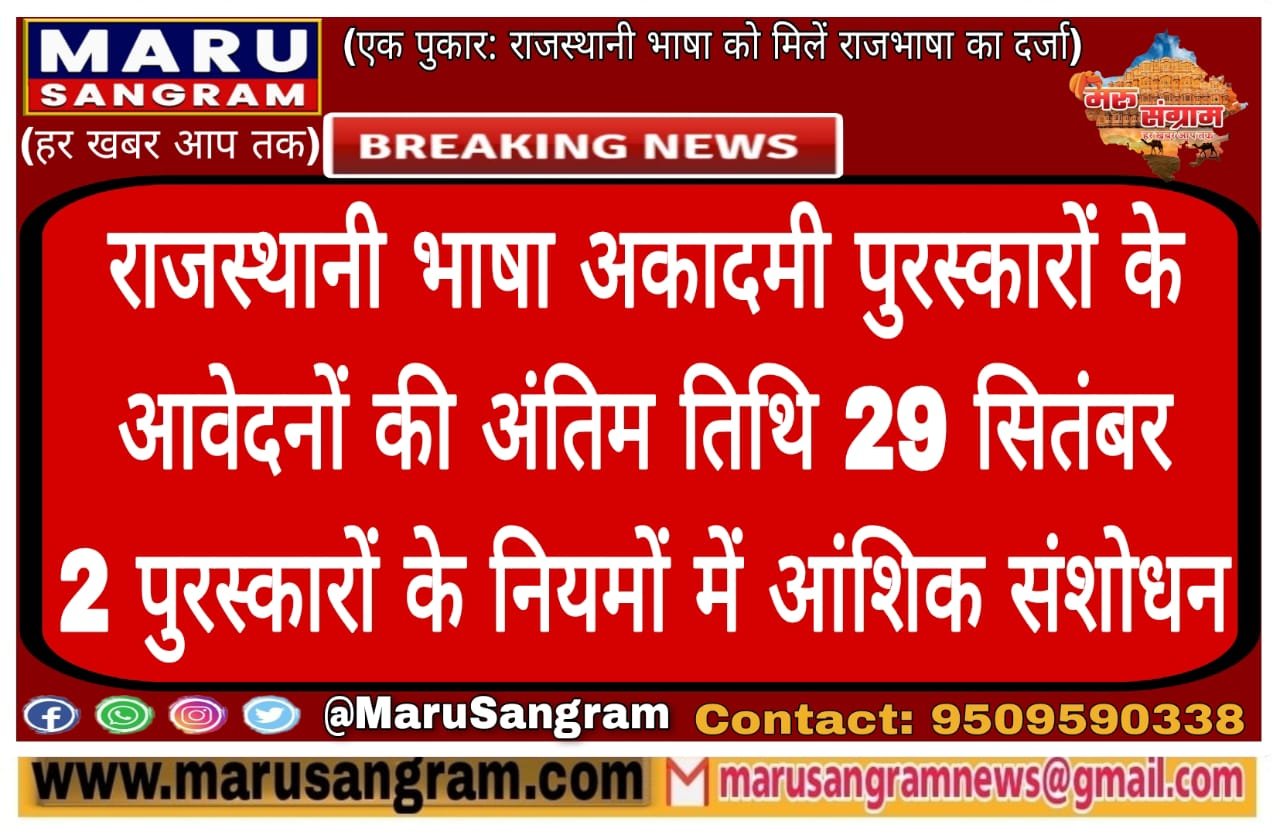 राजस्थानी भाषा अकादमी पुरस्कारों के आवेदनों की अंतिम तिथि 29 सितंबर, 2 पुरस्कारों के नियमों में आंशिक संशोधन….