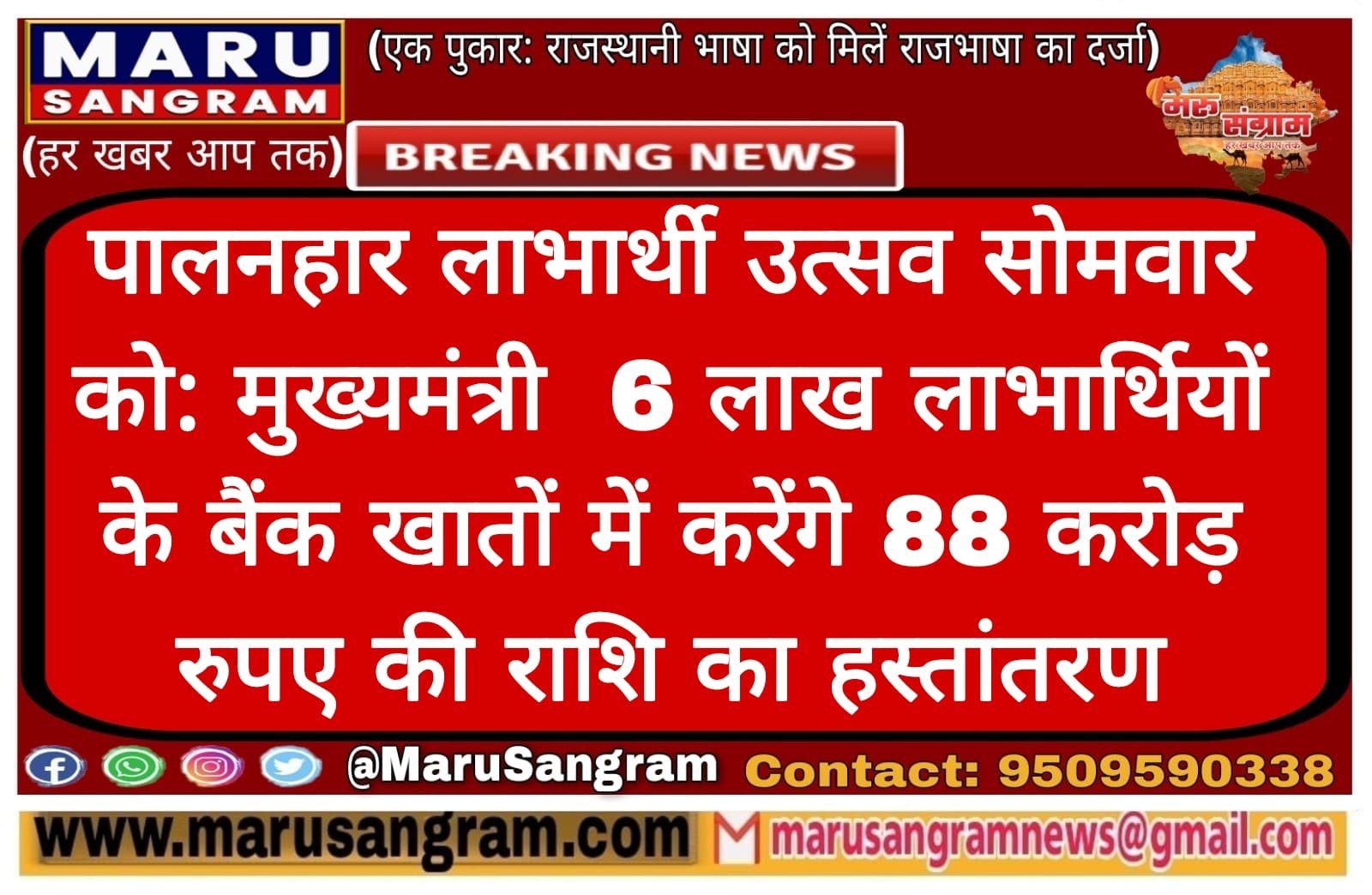 पालनहार लाभार्थी उत्सव सोमवार को: मुख्यमंत्री 6 लाख लाभार्थियों के बैंक खातों में करेंगे 88 करोड़ रुपए की राशि का हस्तांतरण…..