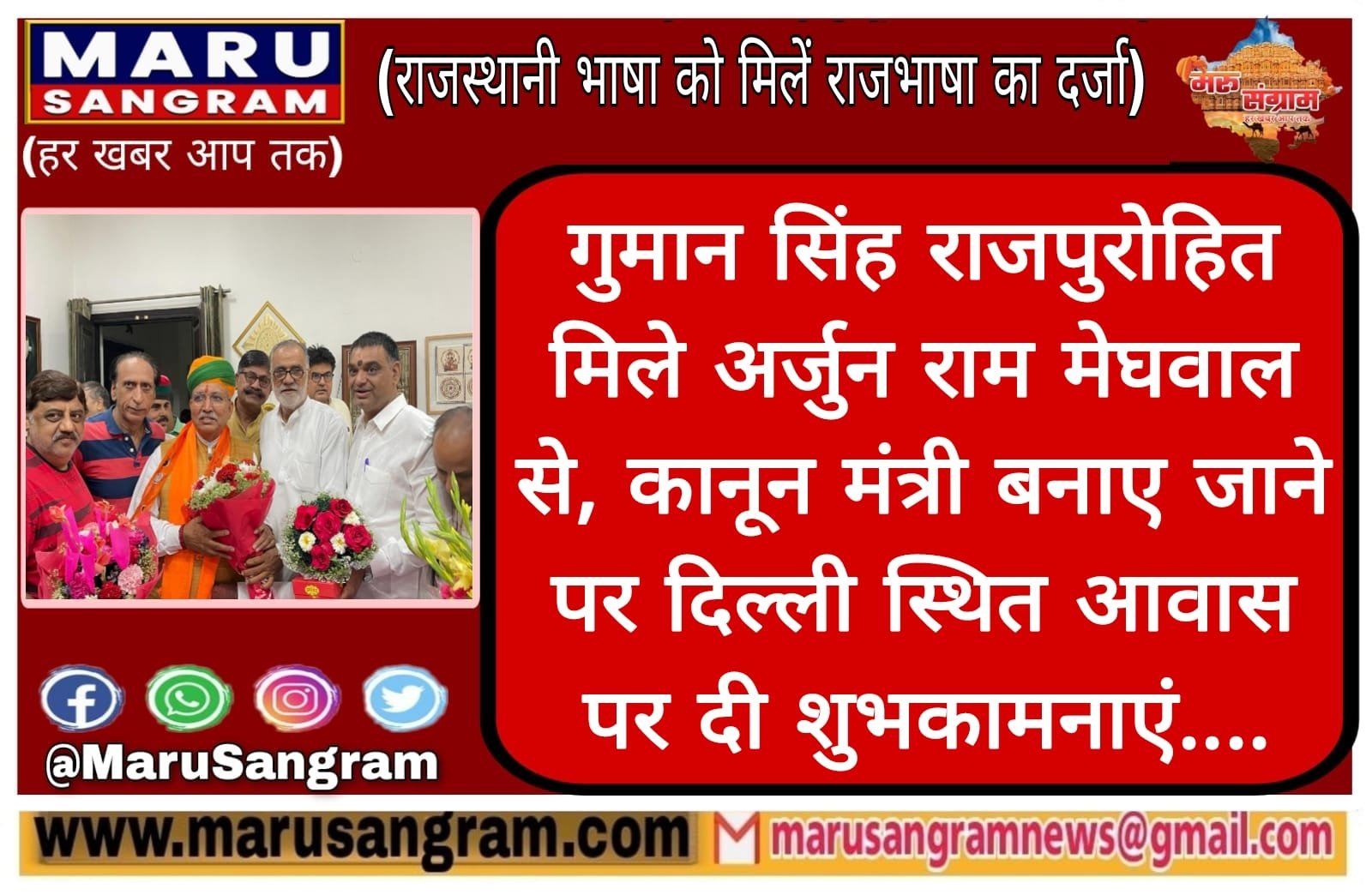 गुमान सिंह राजपुरोहित मिले अर्जुन राम मेघवाल से, कानून मंत्री बनाए जाने पर दिल्ली स्थित आवास पर दी शुभकामनाएं….