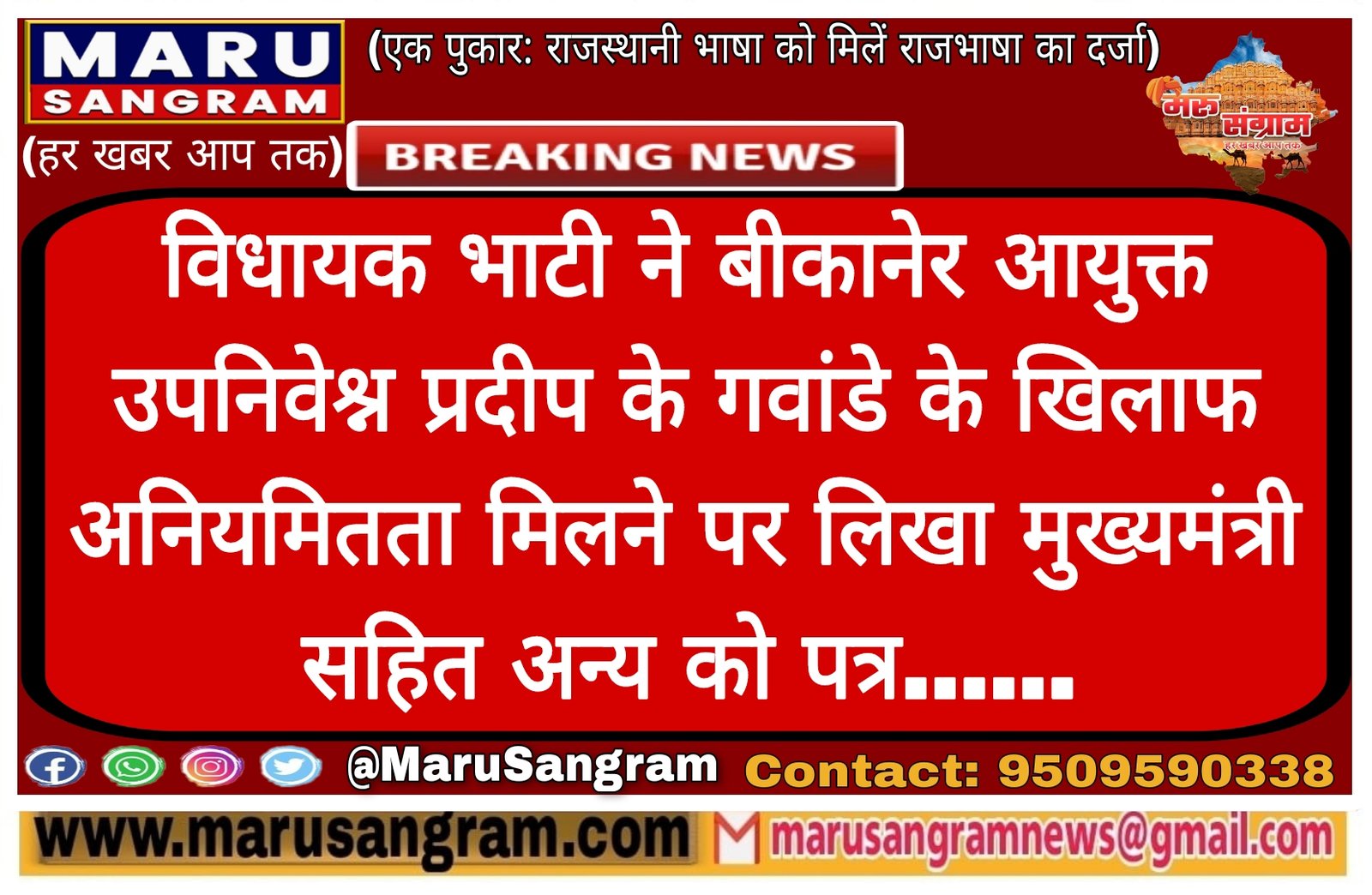 विधायक भाटी ने बीकानेर आयुक्त उपनिवेश्न प्रदीप के गवांडे के खिलाफ अनियमितता मिलने पर लिखा मुख्यमंत्री सहित अन्य को पत्र……
