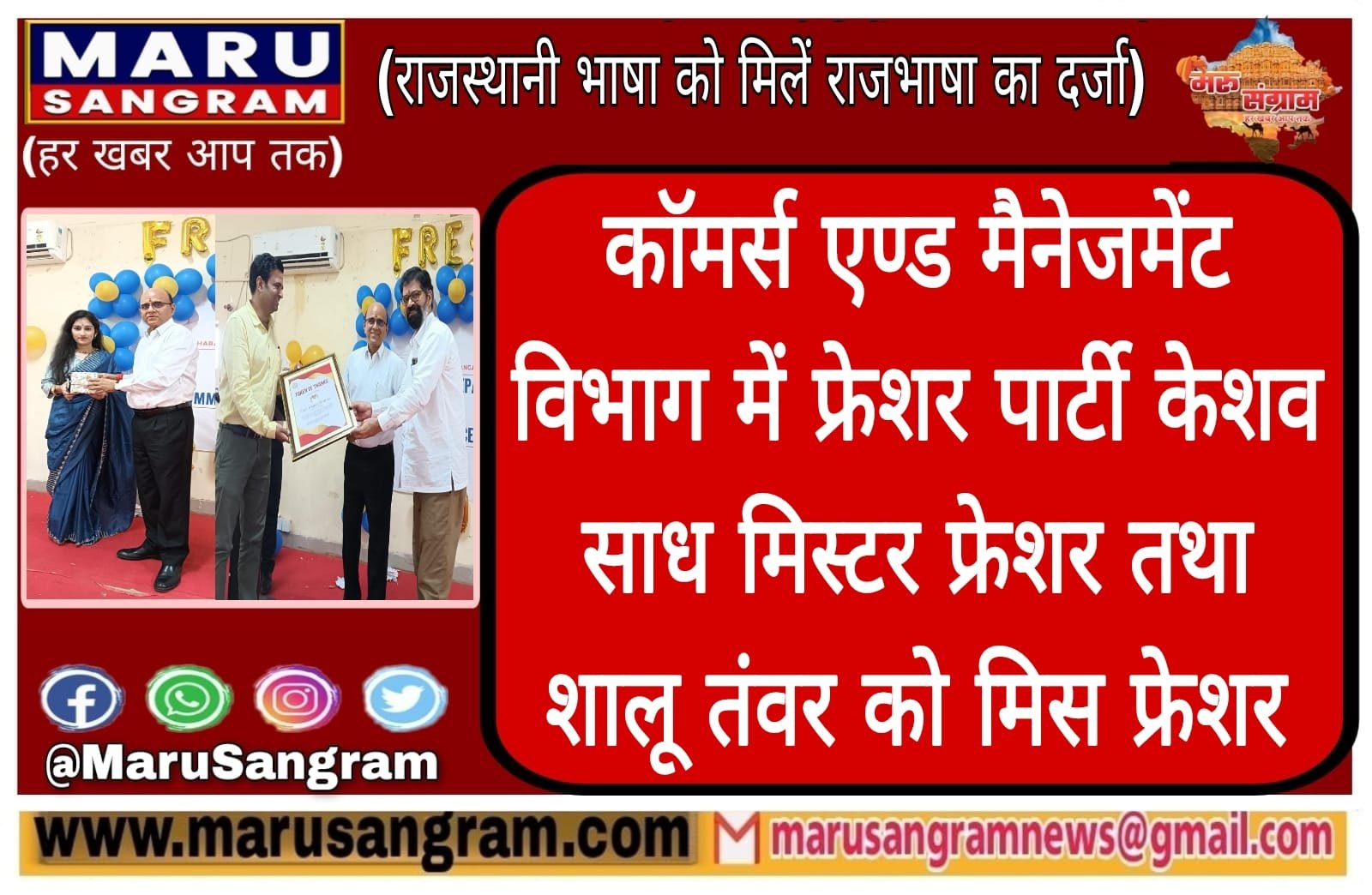 काॅमर्स एण्ड मैनेजमेंट विभाग में फ्रेशर पार्टी केशव साध मिस्टर फ्रेशर तथा शालू तंवर को मिस फ्रेशर….