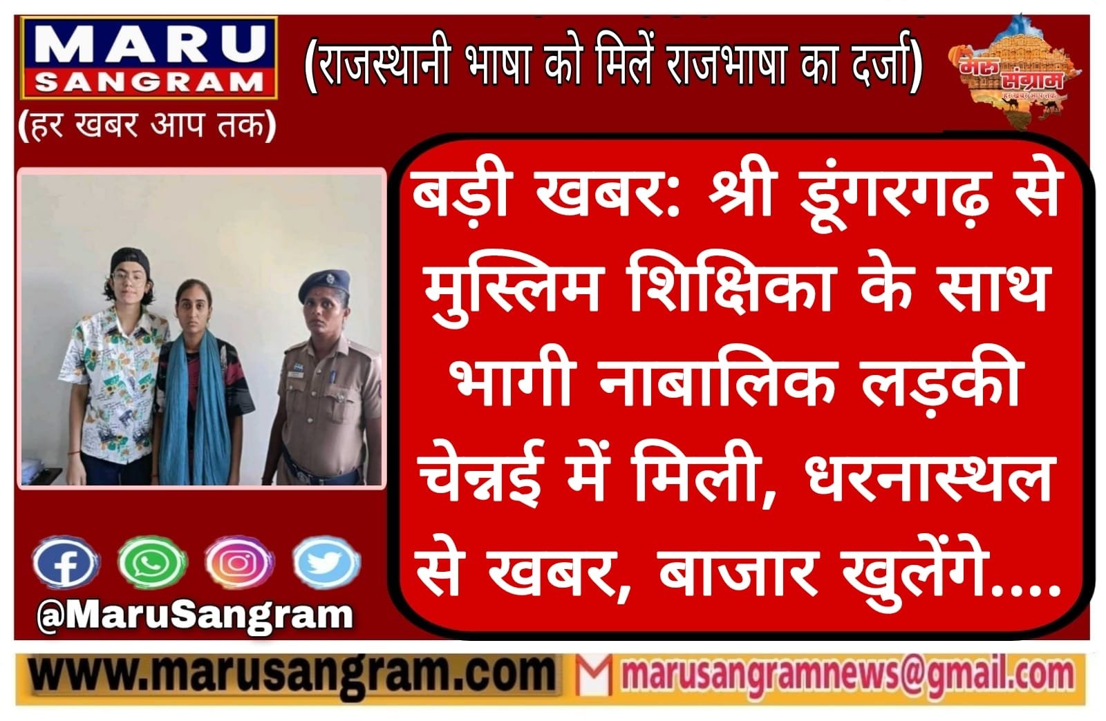बड़ी खबर: श्री डूंगरगढ़ से मुस्लिम शिक्षिका के साथ भागी नाबालिक लड़की चेन्नई में मिली, धरनास्थल से खबर, बाजार खुलेंगे….